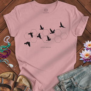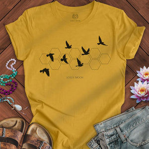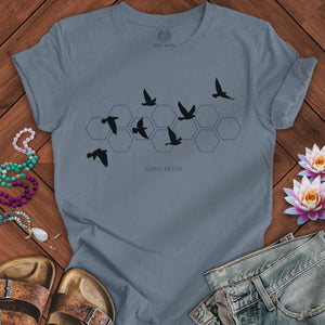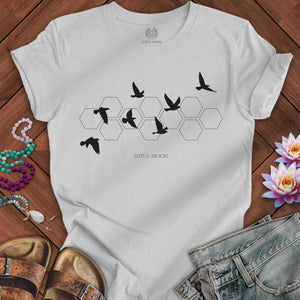 Minimalist Flying Birds T-Shirt – Dark Flock Silhouette with Geometric Hexagon Design – Lotus Moon