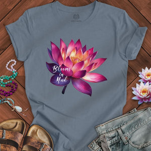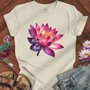 Featuring a striking lotus in radiant pinks and purples, this design captures the spirit of resilience and beauty born from hardship. The soft script quote Blooms in Mud nestled within the petals reminds us that transformation often rises from our toughest moments. Perfect for anyone on a spiritual path or simply embracing growth, this tee is as empowering as it is beautiful.