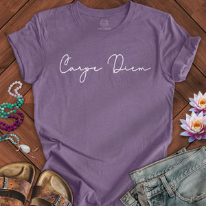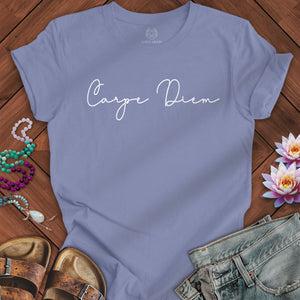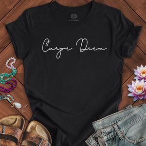 Carpe Diem Script Tee – Inspirational Minimalist T-Shirt for Mindful Living – Lotus Moon