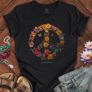 Let your style bloom with the Floral Peace Tee, where vibrant wildflowers come together to form a bold peace symbol bursting with color and good vibes. Tiny butterflies flutter around the floral design, adding a gentle, free-spirited energy to this striking shirt.
