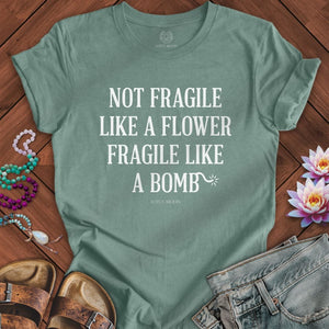 Featuring the striking phrase “Not fragile like a flower, fragile like a bomb” in bold serif lettering, this design celebrates fierce feminine energy and unapologetic resilience. The whimsical fuse detail adds a spark of personality, symbolizing the explosive power of a woman who knows her worth.