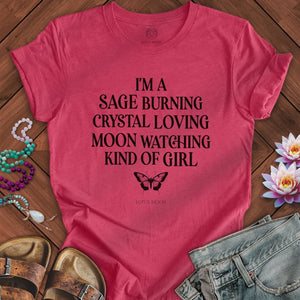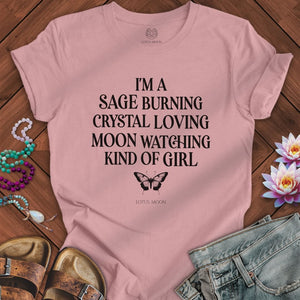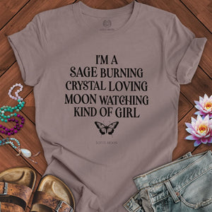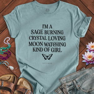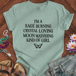 Sage Burning Crystal Loving Moon Watching Kind of Girl Tee – Spiritual Graphic Shirt for Mystical Women – Lotus Moon