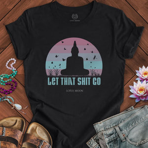 Let That Sh*t Go Buddha Graphic Tee – Retro Sunset Spiritual Shirt for Mindful Living – Lotus Moon