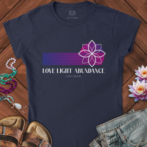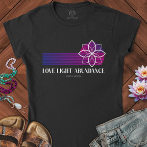 The Love Light Abundance Fitted Tee is a wearable mantra for the radiant soul who knows her energy is her currency. With a retro-cool color palette of violet and magenta, this tee features a stylized lotus blossom rising from a horizon of serenity. The words "Love Light Abundance" anchor the design, acting as a daily affirmation and energetic reminder to align with your highest frequency.