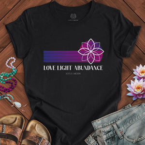 The Love Light Abundance Tee is a wearable mantra for the radiant soul who knows her energy is her currency. With a retro-cool color palette of violet and magenta, this tee features a stylized lotus blossom rising from a horizon of serenity. The words "Love Light Abundance" anchor the design, acting as a daily affirmation and energetic reminder to align with your highest frequency.