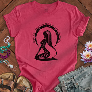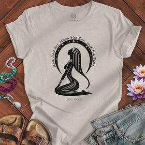 Channel the strength and serenity of lunar energy with the Moon Goddess Tee. Featuring the silhouette of a celestial goddess rising in graceful reverence, this design radiates power and poise. Her form, filled with starlit patterns, bows beneath a crescent moon, surrounded by the uplifting words, “Rise like the Moon the Sun and the Tides.” This is more than a shirt—it's a reminder of the cosmic rhythm that flows through all of us. Whether you're moon-gazing, meditating, or just vibing, this tee empowers your inner goddess with every wear.