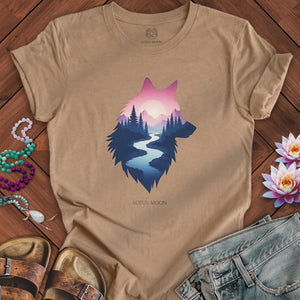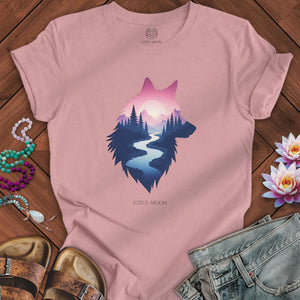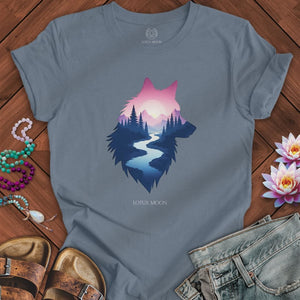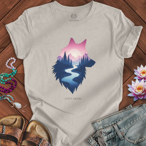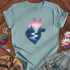 Mountain Wolf Graphic Tee – Spiritual Nature Shirt with Sunset Forest and River Design – Lotus Moon
