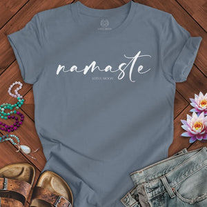 Namaste Script T-Shirt – Minimalist Yoga Tee with Elegant Typography – Lotus Moon