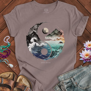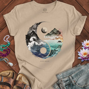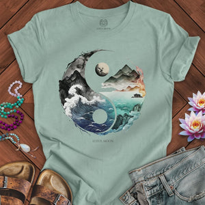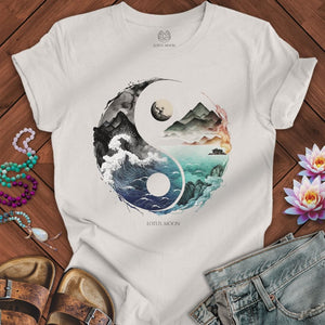 Ocean Yin Yang T-Shirt – Coastal Zen Balance Graphic Tee with Waves & Mountains – Lotus Moon