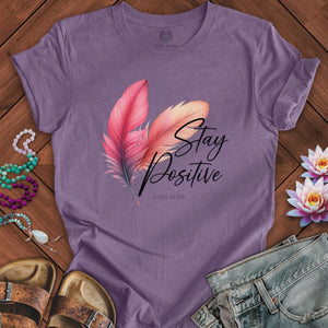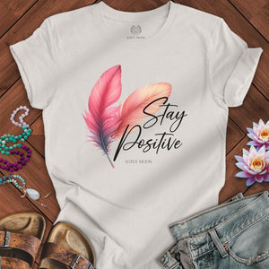 Stay Positive Feather Graphic Tee – Inspirational Boho Shirt for Uplifting Energy & Light Living – Lotus Moon