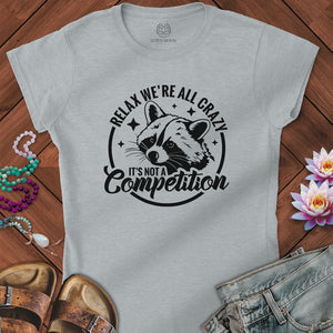 The We're All Crazy Fitted Tee is for the beautifully unhinged souls who know that life isn’t about perfection — it’s about embracing the chaos with humor and heart. Featuring a bold raccoon graphic and the line “Relax, we’re all crazy. It’s not a competition,” this tee brings a dose of levity to your day and a smile to everyone who sees it.