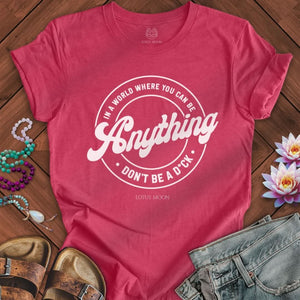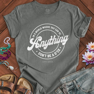 Sometimes the best way to spread positivity is with a little edge—and the You Can Be Anything Tee nails it. Featuring the bold phrase "In a world where you can be anything, don't be a d*ck," this shirt delivers both sass and substance. With clean, circular typography and retro flair, it’s the perfect mix of modern wisdom and vintage cool. Whether you're setting boundaries or setting trends, this tee makes sure your vibe is clear—kindness matters, but so does authenticity.